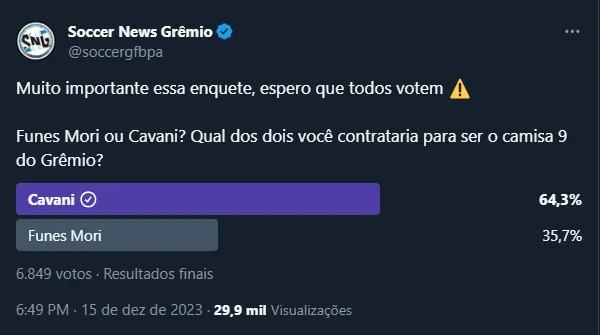 Posto isso, como o Tricolor Gaúcho ainda não definiu qual será o nome a ser contratado, a página Soccer News Grêmio resolveu fazer uma enquete e o resultado foi surpreendente. Afinal, menos de 65% optaram pelo ídolo uruguaio.