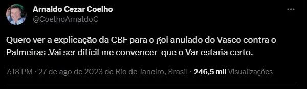 “Quero ver a explicação da CBF para o gol anulado do Vasco contra o Palmeiras. Vai ser difícil me convencer que o Var estaria certo”, escreveu Arnaldo nas redes sociais. Agora, o Vasco precisa focar no próximo compromisso no Campeonato Brasileiro, que será diante do Bahia, no domingo (3), às 18h30, fora de casa.