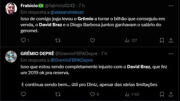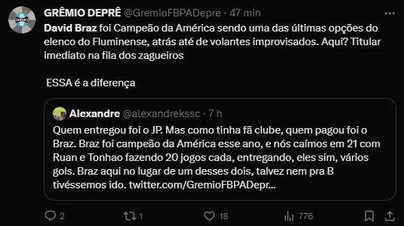Pelo Grêmio, David Braz realizou 68 partidas e marcou sete gols com a camisa gremista. Braz ainda analisou aquele momento em Porto Alegre. De lá, acabou indo para o Fluminense, onde foi campeão da Libertadores nesta temporada.