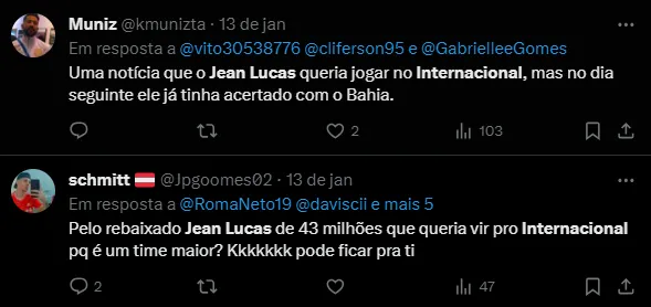 Inter e Bahia disputaram com muita igualdade a contratação de Jean Lucas. Inclusive, o Tricolor usou um emoji de chapéu para anunciar o jogador, brincando com a compra bem sucedida.