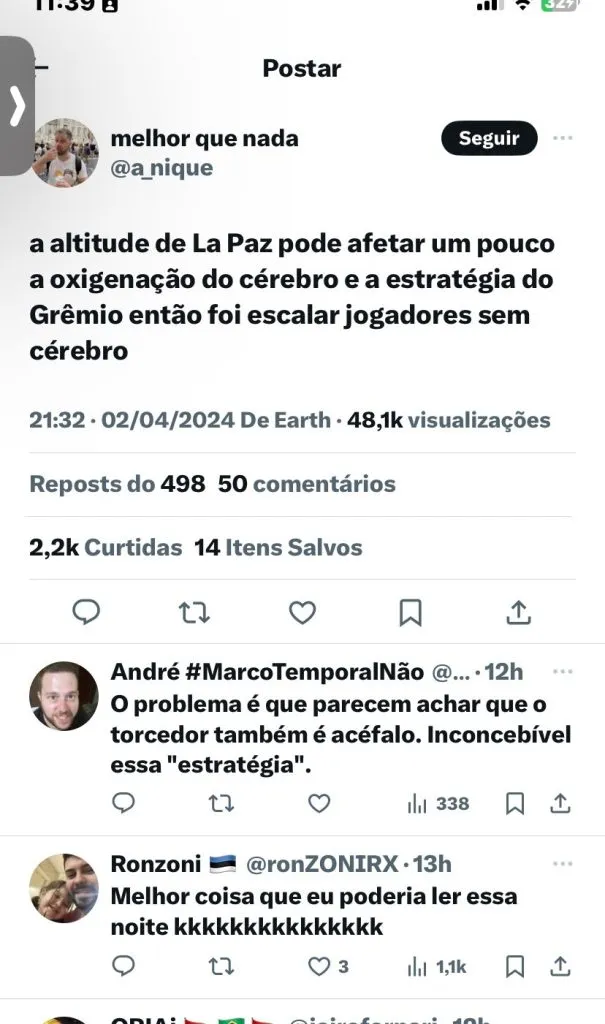 “Acho que o Grêmio pensou na melhor logística. Não tem o que reclamar. A altitude não pode servir de desculpa. A gente falhou. Agora é corrigir os erros para, no próximo jogo, não acontecer de novo”, disse o meio-campista em relação ao fato dos times brasileiros sofrerem com a altitude.