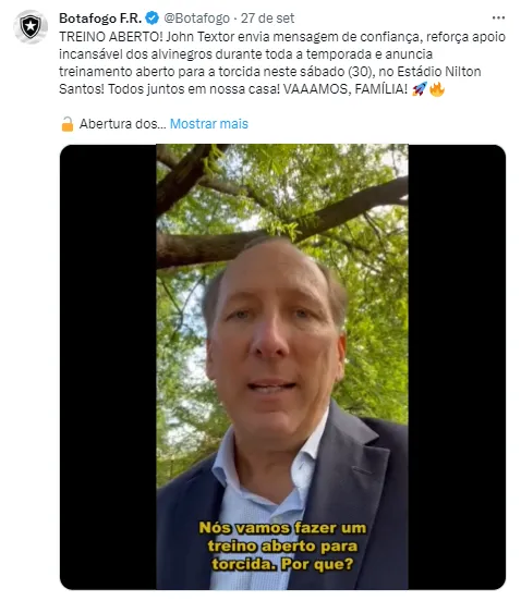 Ainda no vídeo, Textor declarou apoio ao técnico Bruno Lage. “Vocês sabem, vai ser difícil. Eles (os rivais) estão vindo atrás da gente, mas nós vamos fazer isso, com seu apoio, amor e com trabalho duro do técnico Bruno, do nosso estafe do futebol, o time. Eles mostram seu amor por vocês todos os dias no campo de futebol. Vocês sabem que eles estão trabalhando duro. Continuem lutando, continuem apoiando e amando esse time.” Finalizou.