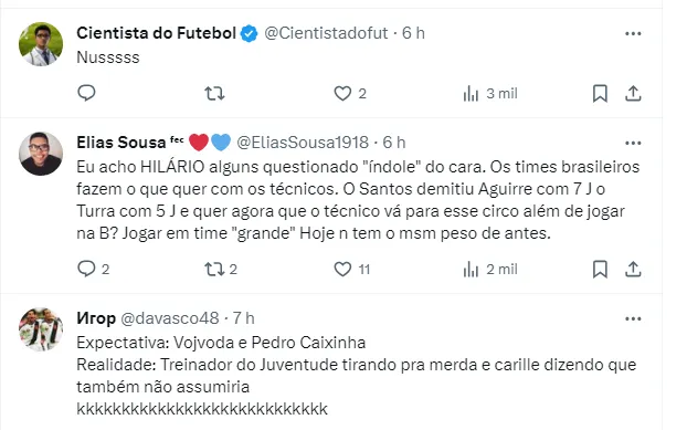 O técnico Thiago Carpini foi alvo do Santos e Cruzeiro, após recuar no clube paulista e seguir tratativas com a equipe mineira. O treinador reavaliou a situação e optou por seguir no Juventude.