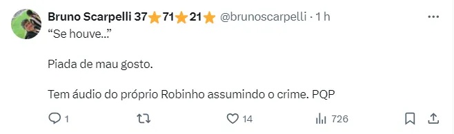 “Como treinador da Seleção, tenho obrigação de me manifestar. Primeiro, acho que é uma situação muito delicada. O Robinho foi meu atleta, uma pessoa fantástica, um profissional desses, dentro da nossa convivência, acima da média”, disse.
