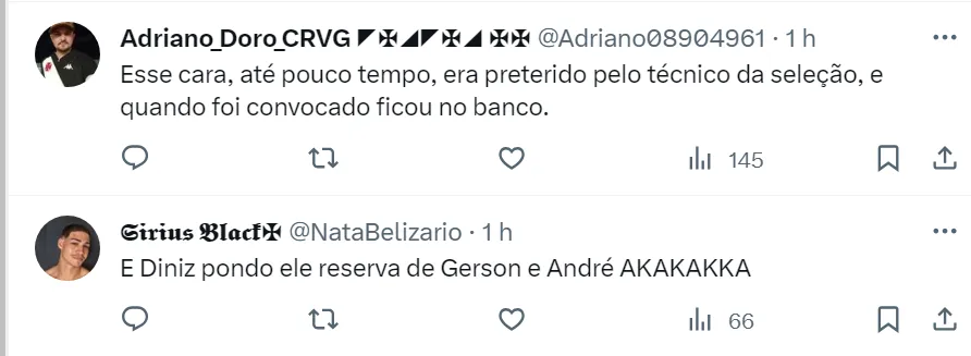 O perfil “News Almirante” postou no Twitter: “Douglas Luiz fez mágica mais uma vez na Premier League!”. Nos comentários, outros torcedores do Vasco rasgaram elogios ao volante e cornetaram o treinador Fernando Diniz.