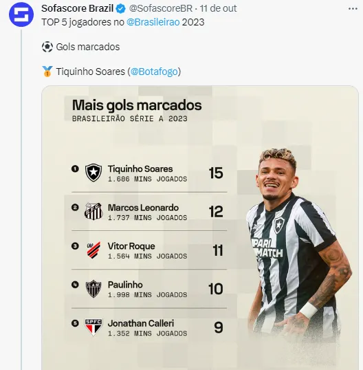 Tiquinho Soares é o artilheiro e o destaque do Brasileirão 2023. A estrela do Botafogo vem fazendo uma temporada de encher os olhos dos torcedores. Tamanha é a eficiência do atacante, que seu aproveitamento na frente do gol, se pontuarmos as chances claras para marcar, alcança um aproveitamento de 93% segundo dados do Sofascore Brasil.