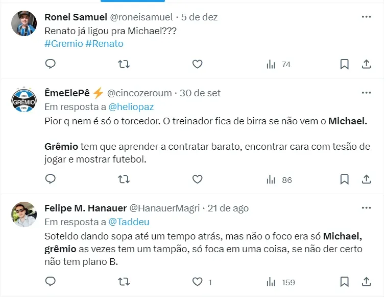 Um dos nomes que o Grêmio vem buscando no mercado é o de Michael, ex-Flamengo e atualmente no Al-Hilal da Arábia Saudita. O Imortal buscou em diversas oportunidades a contratação do jogador, mas os valores acabaram emperrando a negociação.