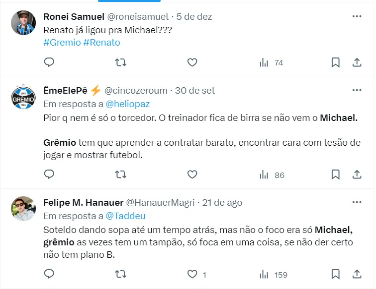 Entretanto, em uma reviravolta, a equipe gaúcha pode ver o ponta reforçando um rival direto no próximo ano. Isso porque, de acordo com informações do Neto, Michael quer retornar ao futebol brasileiro para atuar no Corinthians. É um desejo do jogador, revelou o apresentador.