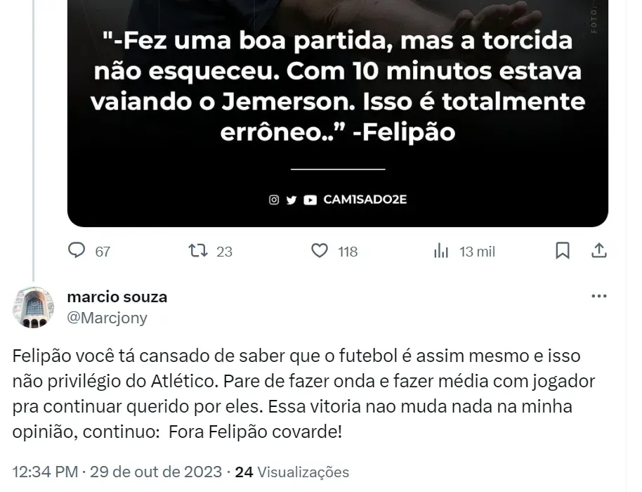 Nos últimos dez jogos, Felipão tem 73% de aproveitamento no comando do Galo. Mesmo com essa melhora na pontuação, a torcida atleticana está convicta que Felipão não pode treinar o time mineiro em 2024.