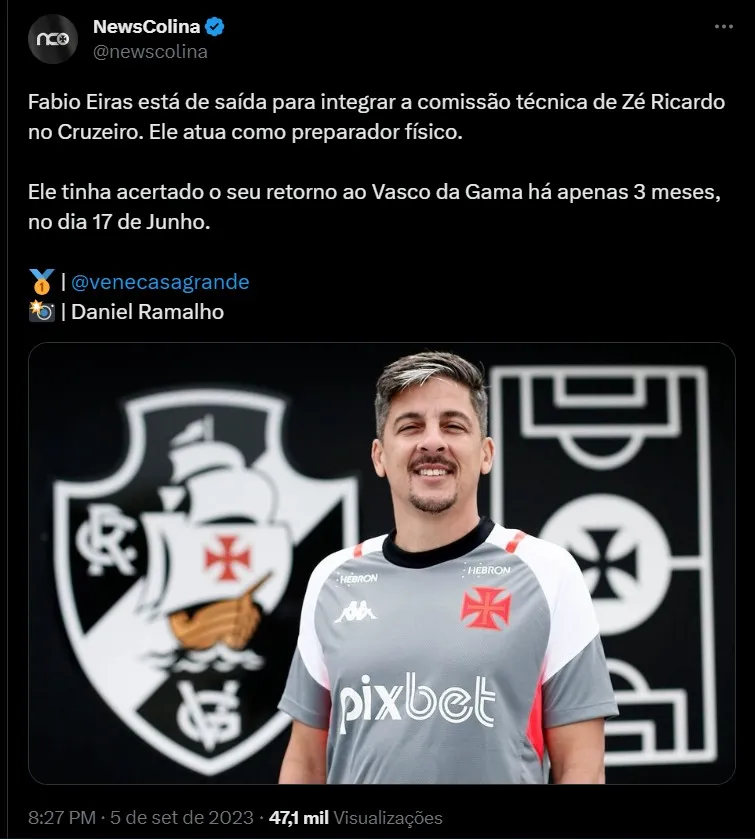 “Fabio Eiras está de saída para integrar a comissão técnica de Zé Ricardo no Cruzeiro. Ele atua como preparador físico. Ele tinha acertado o seu retorno ao Vasco da Gama há apenas 3 meses, no dia 17 de junho”, revelou. Fábio Eiras se tornou uma espécie de braço direito do técnico Zé Ricardo.