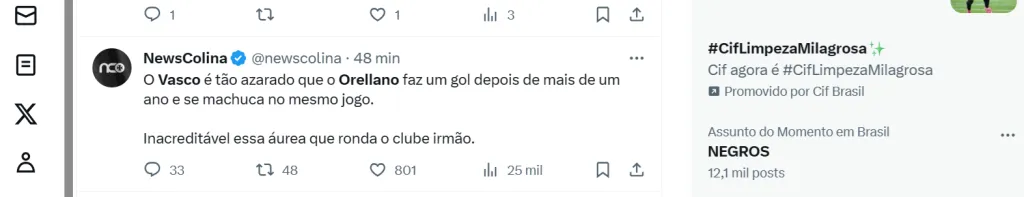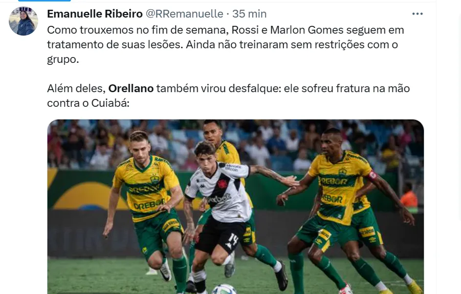 Nas redes sociais, obviamente, o que assunto que mais repercutiu foi a ausência de Orellano. “O Vasco é tão azarado que o Orellano faz um gol depois de mais de um ano e se machuca no mesmo jogo”, ironizou um torcedor no Twitter.