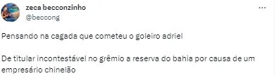 A grande confusão que acabou com o clima de Adriel no Imortal foi na sua troca de empresário que deu o que falar e acabou acarretando sua saída, já que ele foi titular gremista por um tempo. “Pensando na cagada que cometeu o goleiro Adriel de titular incontestável no Grêmio, a reserva do Bahia por causa de um empresário chinelão”.