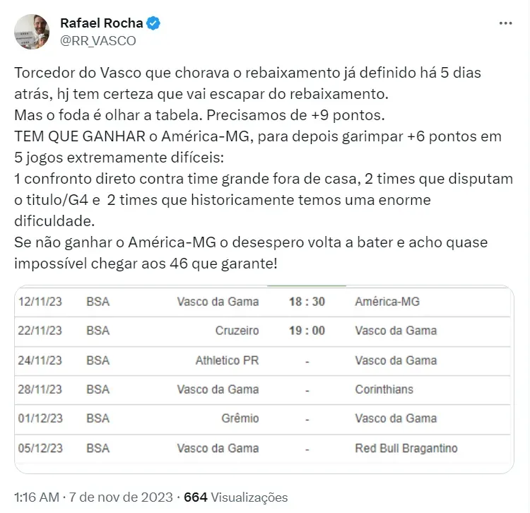 O próximo compromisso da equipe é diante do lanterna do Brasileiro e já rebaixado, América-MG. Mas, essa equipe vem conseguindo fazer Clubes que lutam na parte de cima da tabela perder pontos importantes, o que nesse momento para o Vasco, poderia comprometer o planejamento da equipe.