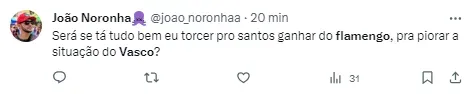 A próxima partida do Santos na Série A é justamente contra o Flamengo, no Estádio Mané Garrincha, na quarta (1), o que pode dividir a torcida do Vasco. Entre torcer contra o Santos e apoiar o maior rival do Rio, os cruz-maltinos terão ainda alguns dias para se posicionar.