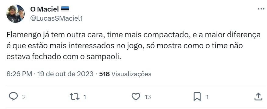 Em participação no Charla Podcast, o jornalista Ricardinho Martins apontou que Sampaoli foi uma decepção no Flamengo, mas explicou um problema que o treinador argentino tem em sua carreira: gestão de grupo. Ele destacou que o ex-treinador do Santos e do Mengão é um cara muito difícil de lidar no dia a dia. Segundo o apresentador, Sampaoli não fala com ninguém no CT, exceto os seus auxiliares.