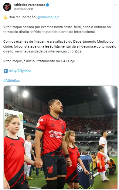 O jogador não precisará de cirurgia, mas não deve mais atuar pelo Athletico em 2023. O Cube anunciou que o jovem de 18 anos teve constatada uma lesão ligamentar da sindesmose na região. Ele já iniciou o tratamento no Centro de Treinamento Caju, mas não há previsão para retorno.