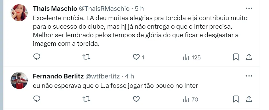 “Ele tem uma proposta em mãos do Vitória e o Inter não vai se opor a este negócio. Afinal, Luiz Adriano também está fora dos planos. Contrato com o Inter finda no meio da temporada e não terá contrato renovado”, explicou o jornalista.