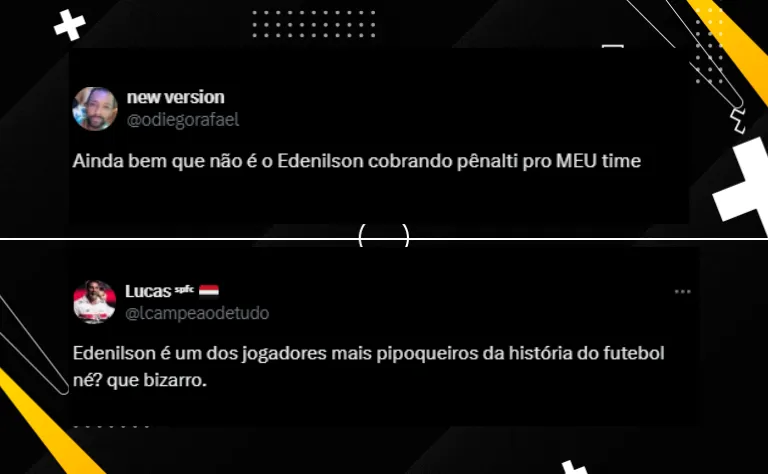 “O Edenilson é muito corintiano”, disse um internauta no X (antigo Twitter). “O Edenilson tinha um plano”, comentou outro torcedor do Timão. Mais um debochou: “O maior torcedor do Corinthians é o Edenilson.”