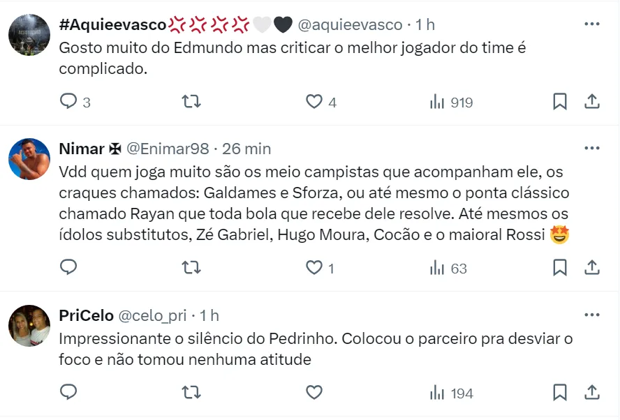 Nas redes sociais, os torcedores do Cruz-Maltino fizeram muitas críticas aos zagueiros Léo Pelé e Maicon. Os vascaínos desejam que os dois jogadores sejam dispensados do Clube Carioca.