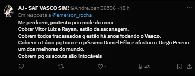 Para o ídolo vascaíno, a promessa de apenas 17 anos, na verdade, é um dos menos culpados, pois ainda se firmando no profissional. “A derrota é de todos: não dá para apontar A, B ou C. E acho que o Rayan é o menos culpado, ele não vinha sendo titular”, iniciou.