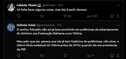 Ednaldo Rodrigues esclareceu que existem duas situações diferentes a respeito da presença de Jailson Macedo Freitas no gramado na partida em questão. O dirigente revelou que ia profissionais são escalados por diferentes organizações.