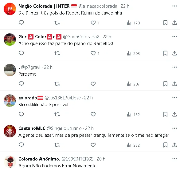 “Era muito difícil que não fosse o Juventude. Vocês conhecem o Inter e sabem as coisas que acontecem. Eu tinha esse pressentimento. Vamos jogar novamente. É um rival difícil. Às vezes sinto que desmerecemos os rivais e hoje o Juventude ganhou do Corinthians. Futebol não é tão fácil. Conheço o sentimento do torcedor do Inter, que não aguenta mais as dificuldades. Entende? Vamos tentar fazer da melhor maneira. Estamos convencidos que vamos brigar“, declarou Coudet.