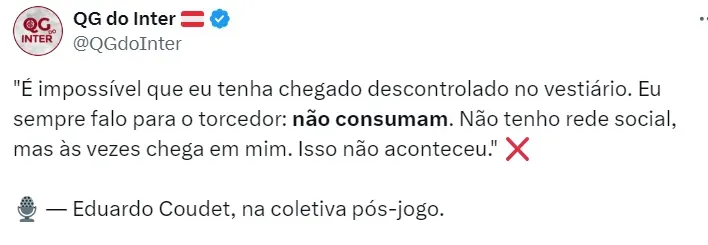 “Contra o Juventude, o senhor foi engolido. No primeiro minuto do primeiro jogo contra o Juventude, todo mundo viu o que o Roger ia fazer. Vai marcar em cima, vai tentar anular com dois caras o Aránguiz e o Alan Patrick. Sabe o que que o senhor fez Eduardo Coudet em 180 minutos? Nada, porque o senhor não sabia o que fazer”, finalizou.