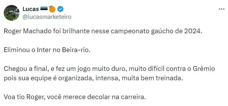 “O Roger, antes de ir pro Grêmio, era colorado”, disse Baldasso. “Presidente Barcellos, o Roger Machado é um cara muito legal. Seria muito bom ser amigo dele também”, brincou o jornalista sobre a amizade entre a diretoria e Coudet.