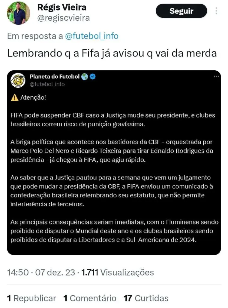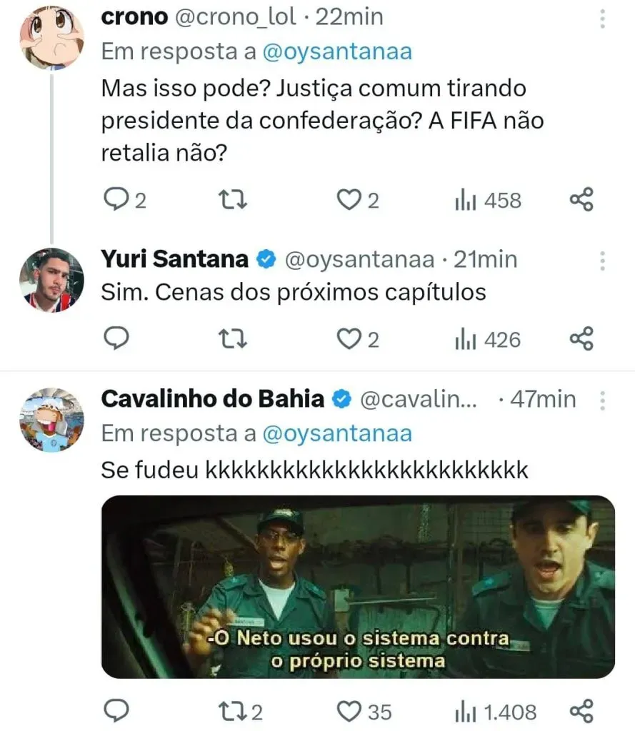 Além disso, José Perdiz, presidente do Superior Tribunal de Justiça Desportiva (STJD), foi designado como interventor para a CBF. Em 30 dias a CBF deve realizar uma nova eleição para determinar quem assume o lugar de Ednaldo Rodrigues, vale destacar, no entanto, que ainda cabe recurso ao agora ex-presidente.