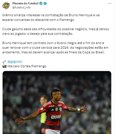 Nos últimos dias, o nome do atacante Bruno Henrique, que pertence ao Flamengo, foi especulado no Grêmio. Com a saída de Suárez no fim desta temporada, o experiente atacante do Fla seria uma opção para fortalecer o ataque do Tricolor para 2024.