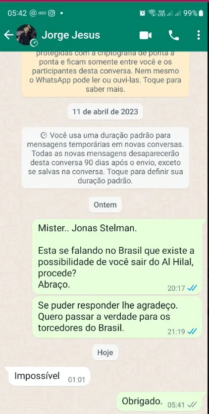 Apesar de não atuar no futebol nacional há alguns anos, a sua passagem foi marcante no Brasil, que faz com que o nome do treinador seja sempre especulado para um possível retorno. Diante disso, o comunicador Jonas Stelmann questionou a possibilidade de Jorge Jesus sair do futebol árabe nesse momento. De forma categórica, o treinador classificou a possibilidade como algo ‘impossível’ nesse momento.