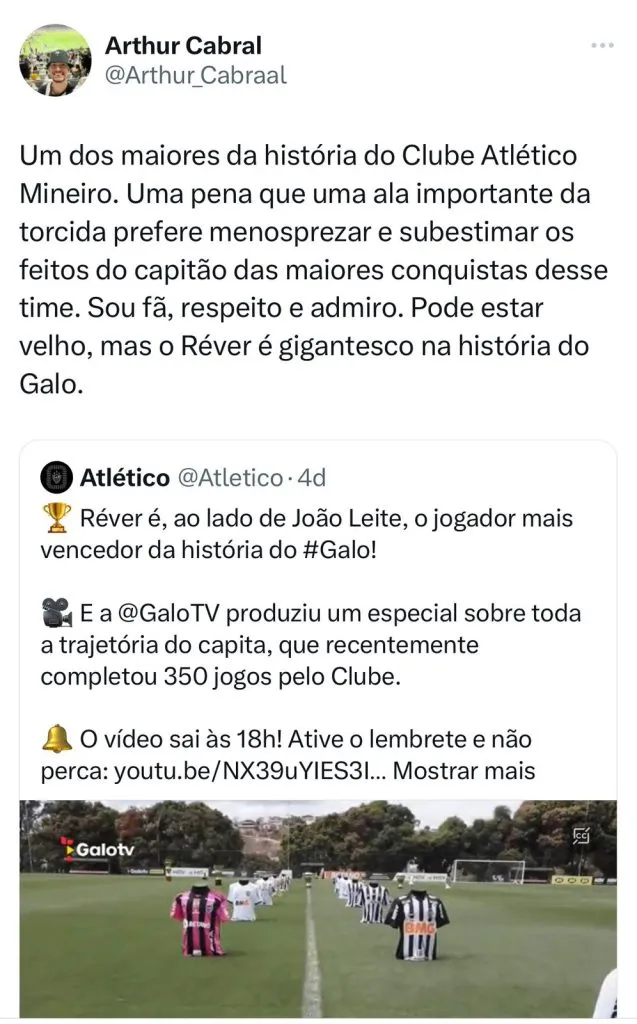 Isso porque o Atlético-MG montou uma homenagem especial para o zagueiro Réver, que completou 350 jogos no clube recentemente. O zagueiro foi o jogador atleticano que mais conquistou títulos pelo time alvinegro. O defensor deve fazer seus últimos jogos pelo Galo ainda nesta temporada e depois se aposentar e mudar de área no esporte.