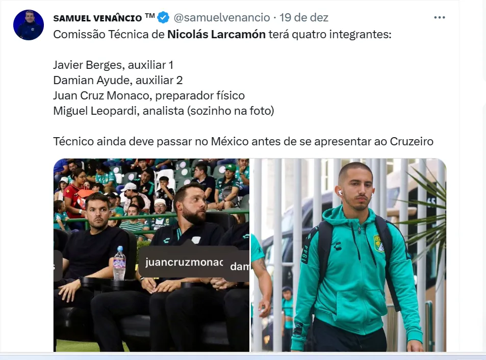 Para o comando técnico, o argentino Nicolás Larcamón, ex-León, do México, foi anunciado nesta semana. O treinador de 39 anos fechou um acordo válido até o fim de 2025.