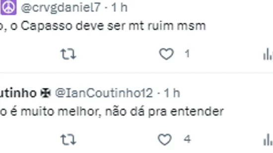 Após a situação vazar na web, a torcida não ficou nada feliz e muitos criticaram caso Maicon inicie entre os titulares. “Agora fiquei preocupado com o jogo“, “Perdemos, não tem o que falar“, “Meu Deus, não!‘, “Kkk. Esse ‘pardal’ está de sacanagem, o Maicon é uma Scania irmão p*“, “O Capasso deve ter feito algo de muito errado pra alguém aí“, “Imagina ele marcando Dudu e companhia“,”Não é possível que o Capasso seja pior que esse cara nos treinos, não é possível“, “Capasso deve treinar em uma tremenda má vontade“.