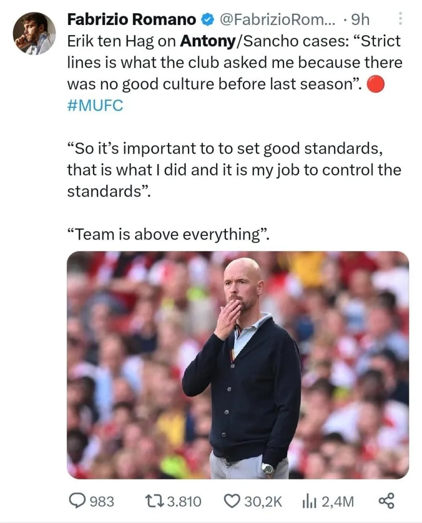 Nesta sexta, o técnico Ten Hag tentou esclarecer a situação atual do jogador com o clube e afirmou que não sabe quando o atleta vai voltar a atuar com a equipe. O holandês ainda contou sobre o sentimento de Antony diante da situação. “Não faço ideia (de quando volta). Claro que ele está decepcionado, mas ele está bem”, disse o treinador de forma breve.
