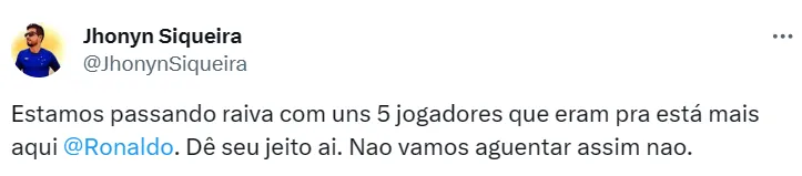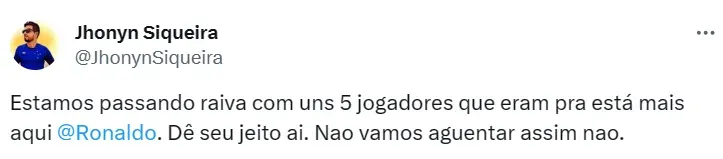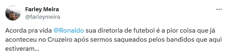 Proprietário da SAF que adquiriu 90% das ações do clube, Ronaldo é um dos alvos da torcida cruzeirense, revoltada com a situação que o time passa em 2023. Assim como nas redes sociais, nos estádios o Fenômeno é hostilizado.