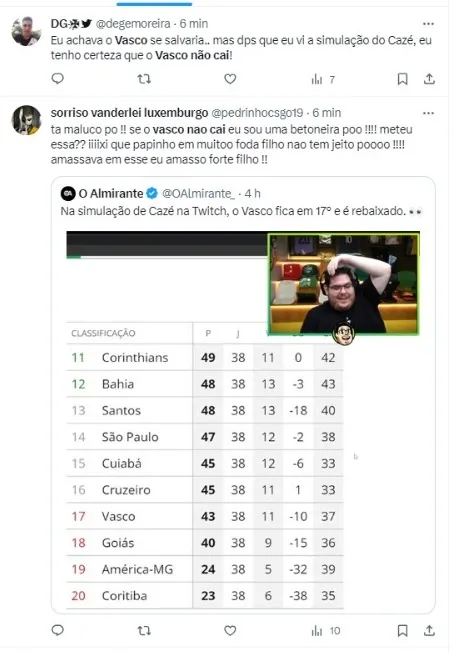 A repercussão, no entanto, veio no fim: ao simular os resultados, o influenciador e torcedor vascaíno colocou a Raposa fora do zona de rebaixamento, com 45 pontos. Enquanto isso, o Gigante da Colina terminou como primeiro time dento do Z4, com 43.