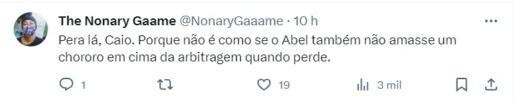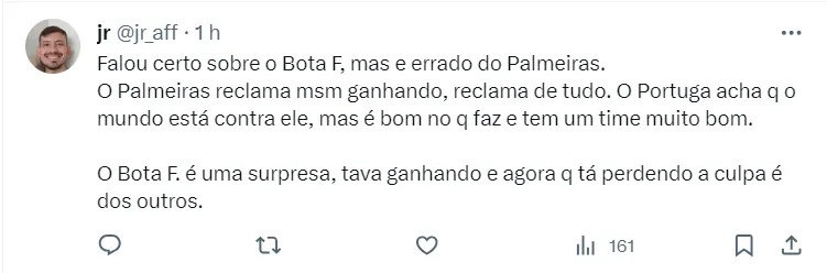 “Hoje não cabe mais esse tipo de discurso (reclamar da arbitragem). O Botafogo não está sabendo lidar com a pressão, coisa que o Palmeiras faz melhor do que ninguém. Dos últimos 4 jogos, o Botafogo fez 1 ponto. 1 ponto de 12. Aí entra nesse discurso de ‘contra tudo e contra todos’”, destacou.