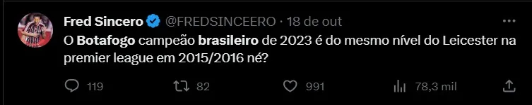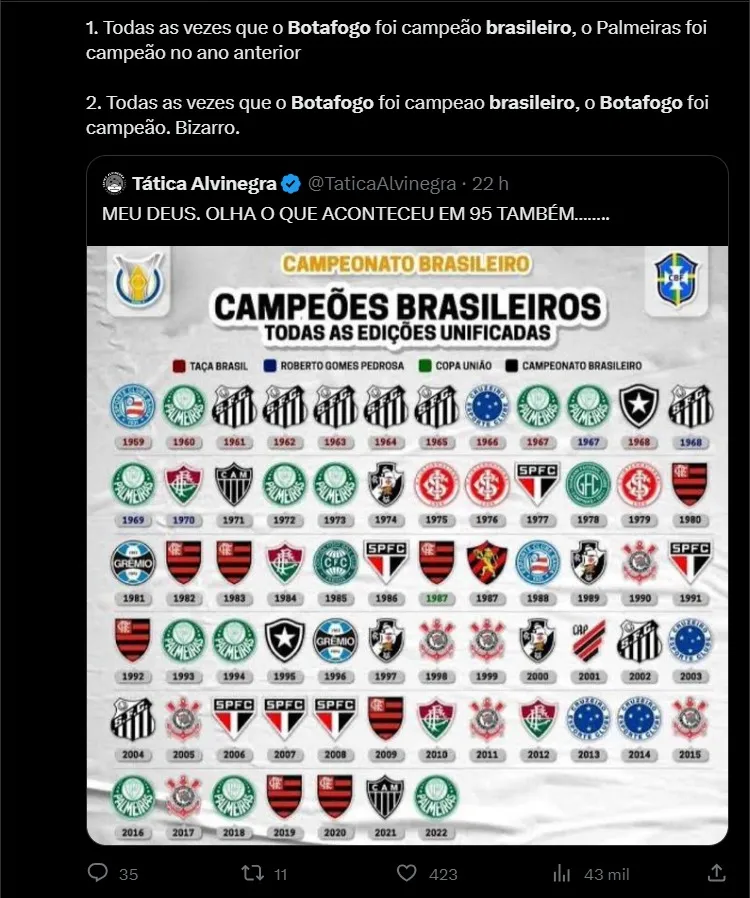 “No returno, o Corinthians começou perdendo três dos primeiros quatro jogos, começou assustando, como o Botafogo também. O Corinthians foi o 12º lugar do returno, o Botafogo hoje é o 10º. Houve uma queda brutal e mesmo assim o Corinthians foi campeão. A dez rodadas do fim, o Corinthians tinha 58 pontos, o Botafogo tem 59. O Corinthians tinha uma vantagem um pouco maior, de nove, o Botafogo tem sete. E a menor distância no returno foi de cinco pontos, na 31ª rodada. É muito parecido com o Corinthians de 2017”, destacou.