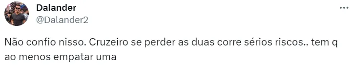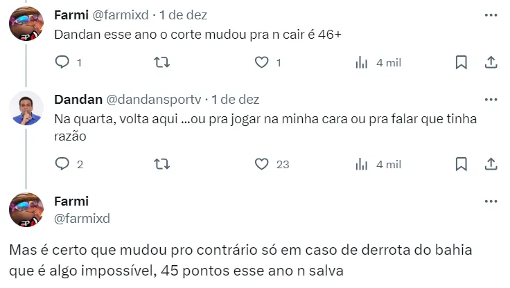 “Cruzeiro de férias e a briga está entre Bahia, Vasco e Santos. Bom dia!”, complementou Dandan, cravando a permanência do Cabuloso na elite do futebol nacional em 2024.