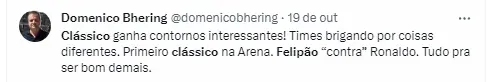 “O Cruzeiro hoje perdeu um jogo para o Flamengo, mas domingo vai estar motivadíssimo para o nosso jogo. E se nós achamos que ganhando o jogo aqui, ‘ah, já fizemos’, pode esquecer. É um jogo horrível, difícil. E se eles, e se nós, se os torcedores entenderem que vai ser simples, esqueçam, esqueçam. Vai ser muito difícil vencer o Cruzeiro, e nós vamos nos preparar para esta vitória, porque quem sabe com uma vitória nós podemos dar um grande passo que nos falta de firmar essa equipe totalmente no restante do campeonato”, finalizou o treinador.
