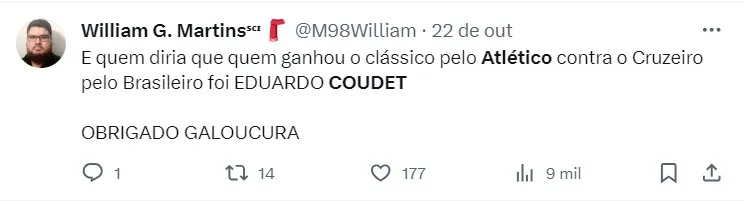 “Hoje, o Felipão, conseguiu entender e me dar essa liberdade. Com certeza é a melhor forma que me sinto para jogar, mais solto, mais perto do Hulk”, completou. Paulinho ainda relembrou a passagem de Coudet pelo Galo e elogiou o trabalho do treinador.