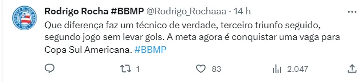 “Acho que esse é o Bahia que o torcedor sonha, que todos nós aqui desejamos (…) Não posso falar como era antes, mas posso falar quando eu jogava. Eu quero vencer, não quero outro resultado que não seja o triunfo, tanto que na minha carreira como treinador sempre tenho mais vitórias e derrotas do que empates. Aqui são quatro vitórias e duas derrotas. Não sei muito jogar pelo empate. Penso sempre em tentar vencer, e tem que ter coragem (…)”, explicou.