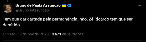 O treinador, inclusive, confia no trabalho e será pego de surpresa caso fosse demitido do comando do Cruzeiro, segundo o jornalista Alê Oliveira, que conversou com Zé Ricardo neste domingo (12).