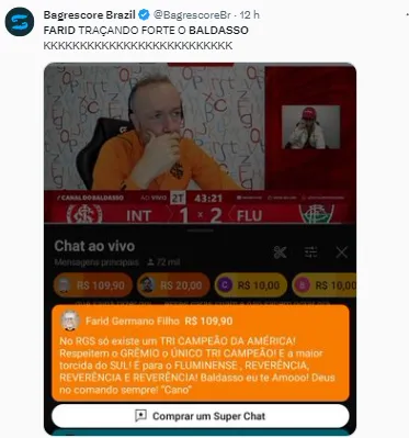 “No Rio Grande do Sul existe um tricampeão da América! Respeitem o Grêmio, o único tricampeão! E a maior torcida do Sul! E para o Fluminense, reverência, reverência e reverência! Baldasso, eu te amo! Deus no comando, sempre”, publicou Farid na live do Baldasso.