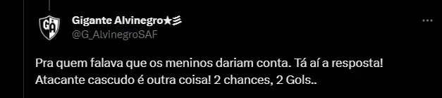 O atacante naturalizado espanhol fez os dois gols no primeiro tempo e o Glorioso acabou administrando o resultado no segundo e finalizando mais uma vitória com gol de outro atacante, Luis Henrique, que entrou durante a partida, após grande jogada de Hugo.