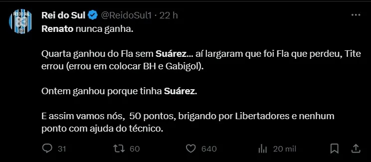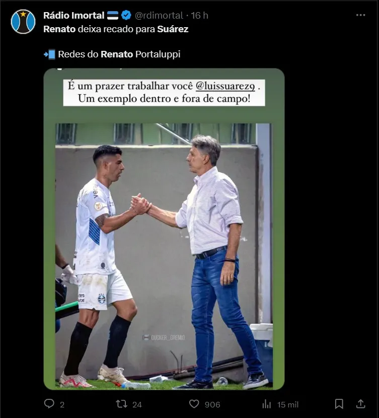 Através das redes sociais, Renato se manifestou sobre Suárez no Grêmio