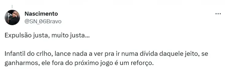 Nas redes sociais, Eduardo foi muito criticado pelos torcedores, que já vinham pegando no pé do meio-campista pelo desempenho demonstrado nos últimos jogos. O jogador será desfalque no duelo contra o Cruzeiro, domingo (3).