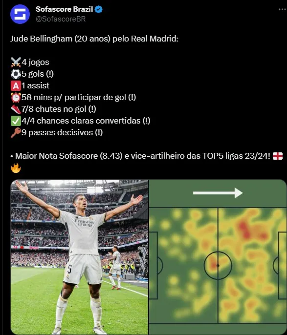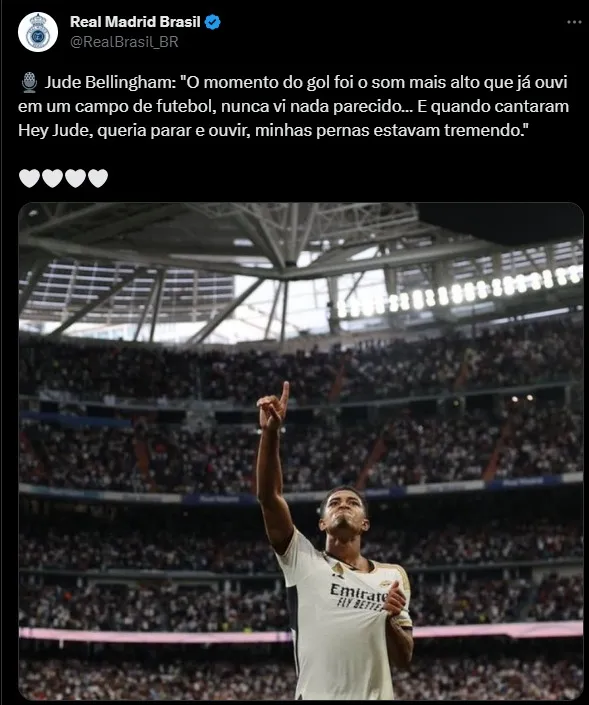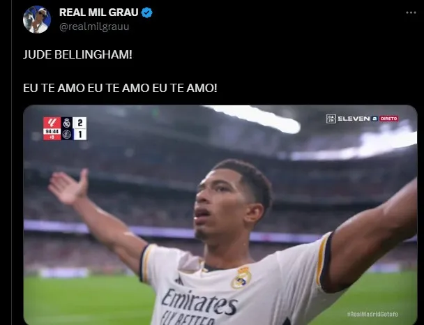 Após o gol da vitória sobre o Getafe, as redes sociais enlouqueceram de elogios ao craque novo do Real Madrid. O time merengue e sua torcida é apenas alegria com Bellingham, que vem brilhando em todos os jogos desde sua chegada ao time de Madrid.