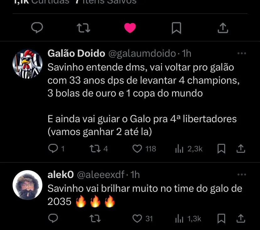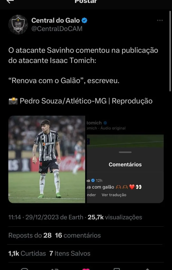 Diante disso, o destaque do Girona é ex-Atlético, Savinho através das redes sociais pediu para Isaac permanecer: (SIC)Renova com o Galão”, escreveu Savinho, em postagem de Isaac no Instagram. Obviamente, a torcida do Galo foi a loucura com tal feito.